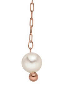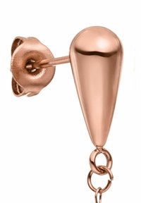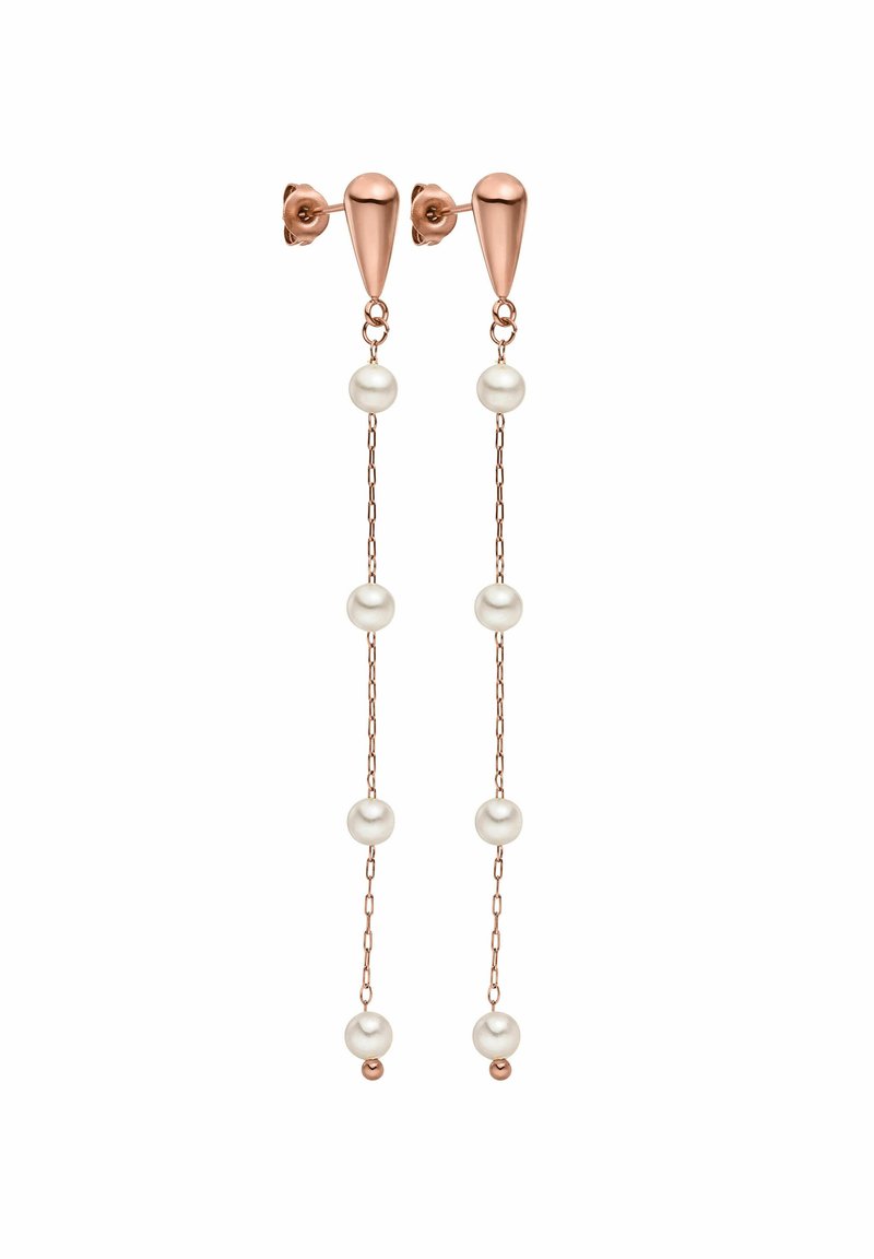 Ohrringe aus Roségold mit länglichen kegelförmigen Stiften, an denen vier weiße Perlen auf zarten Kettenringen befestigt sind.