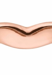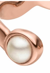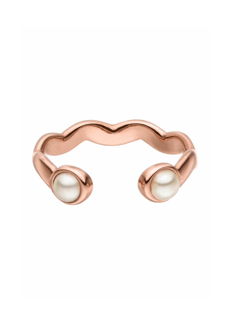 Ringe aus roségoldfarbenem Metall mit einem wellenförmigen Design und zwei weißen Perlenakzenten. Glatte Oberfläche mit schimmerndem Finish.