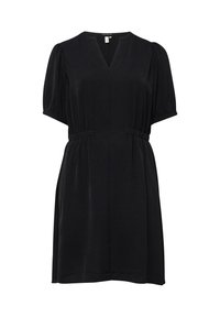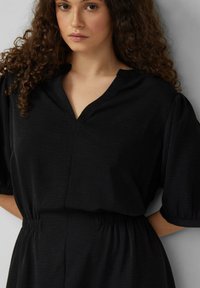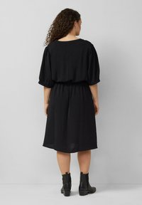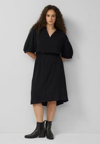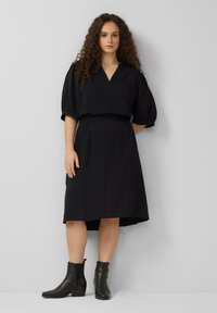 Frau mit langen lockigen Haaren, die ein schwarzes Midikleid mit Puffärmeln und schwarze Stiefeletten trägt, steht vor einer schlichten hellen Wand.