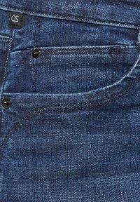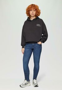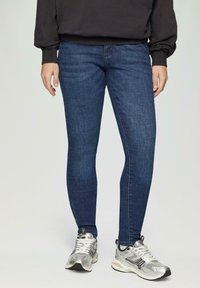 Dunkelblaue Skinny-Jeans aus Denim, mit klassischem Fünf-Taschen-Design und getragen mit silbernen Sportschuhen.