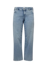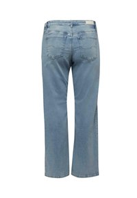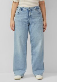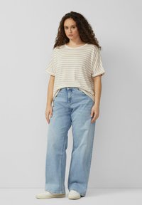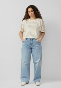 Person trägt helle, weit geschnittene blaue Jeans, beige-weiß gestreiftes Oberteil und weiße Turnschuhe, steht vor einem schlichten grauen Hintergrund.