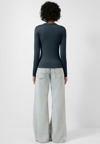 Eng anliegendes Langarmshirt in Dunkelgrau aus weichem Stoff. Es verfügt über einen runden Ausschnitt und minimalistische Nähte. Kombiniert mit hellen Jeans.
