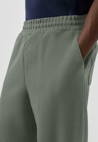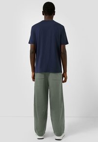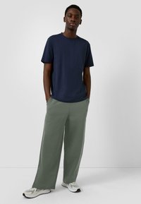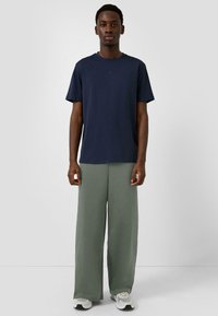 Mann steht vor einem schlichten Hintergrund und trägt ein dunkelblaues T-Shirt mit kurzen Ärmeln, lockere olivgrüne Hosen und weiße Turnschuhe.