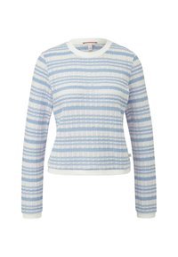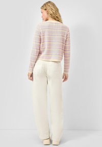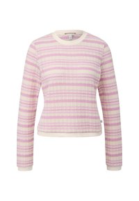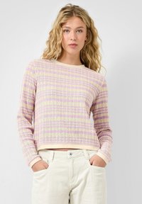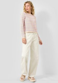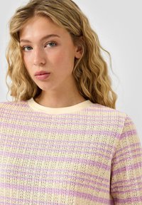 Junge Frau mit welligem blondem Haar, die ein langärmeliges Oberteil mit pastellgelb-lila Streifen und weiße Hosen trägt, die Hände in den Taschen.