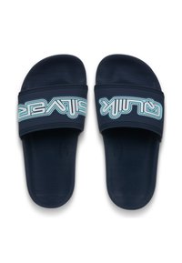 Marineblaue Slide-Sandale mit gepolstertem Riemen, auf dem ein hellblaues und weißes "SR"-Logo zu sehen ist, flache Sohle und offenem Zehendesign.