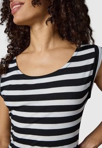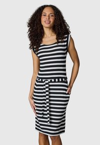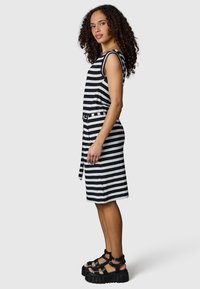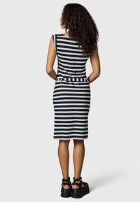 Frau mit lockigem Haar, die ein schwarz-weiß gestreiftes, ärmelloses Kleid mit Taillengürtel trägt, steht vor einem schlichten Hintergrund.
