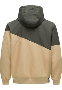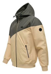 Herren-Kapuzenjacke mit beigem Unterteil und Ärmeln, olivgrünem Oberteil und Kapuze, Reißverschluss vorne und Reißverschlusstaschen an den Seiten.