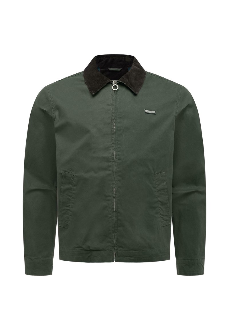 Dunkelgrüne Jacke mit Reißverschluss, schwarzem Cordkragen und zwei Fronttaschen, mit kleinem rechteckigem Logo auf der Brust.