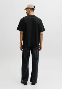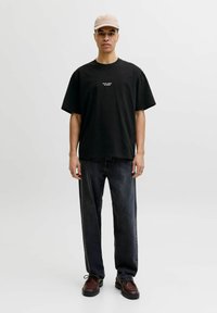 Junger Mann mit beige-farbenem Cap, schwarzem übergroßem T-Shirt mit dem Schriftzug "Royal Denim Division" und dunkler Jeans, steht vor neutralem Hintergrund.