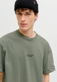 Olivegrünes oversized T-Shirt aus Baumwolle, mit Rundhalsausschnitt und kurzen Ärmeln, vorne mit schwarzem Schriftzug "ROYAL DENIM DIVISION".