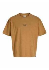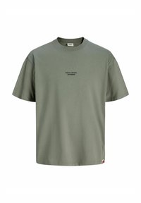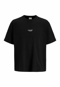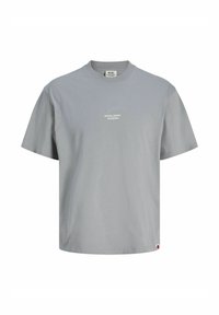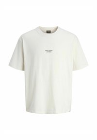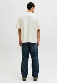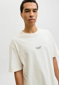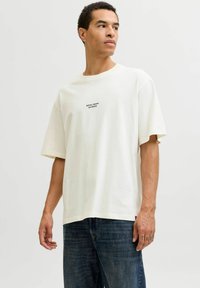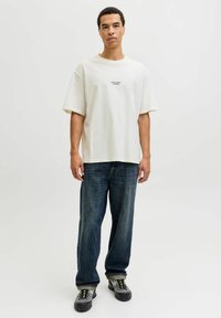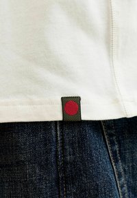 Weißes Baumwoll-T-Shirt mit rundem Ausschnitt, kurzen Ärmeln und kleinem schwarzem Logotext auf der linken Seite. Kombiniert mit blauen Jeans aus Denim.
