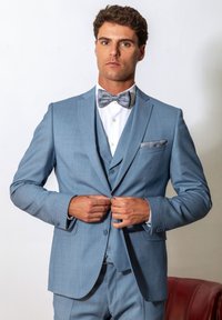 Mann, der einen Knopf an einer hellblauen Anzugjacke befestigt, trägt eine passende Weste, weißes Hemd und gemusterten Fliegenknoten, steht vor weißem Hintergrund.