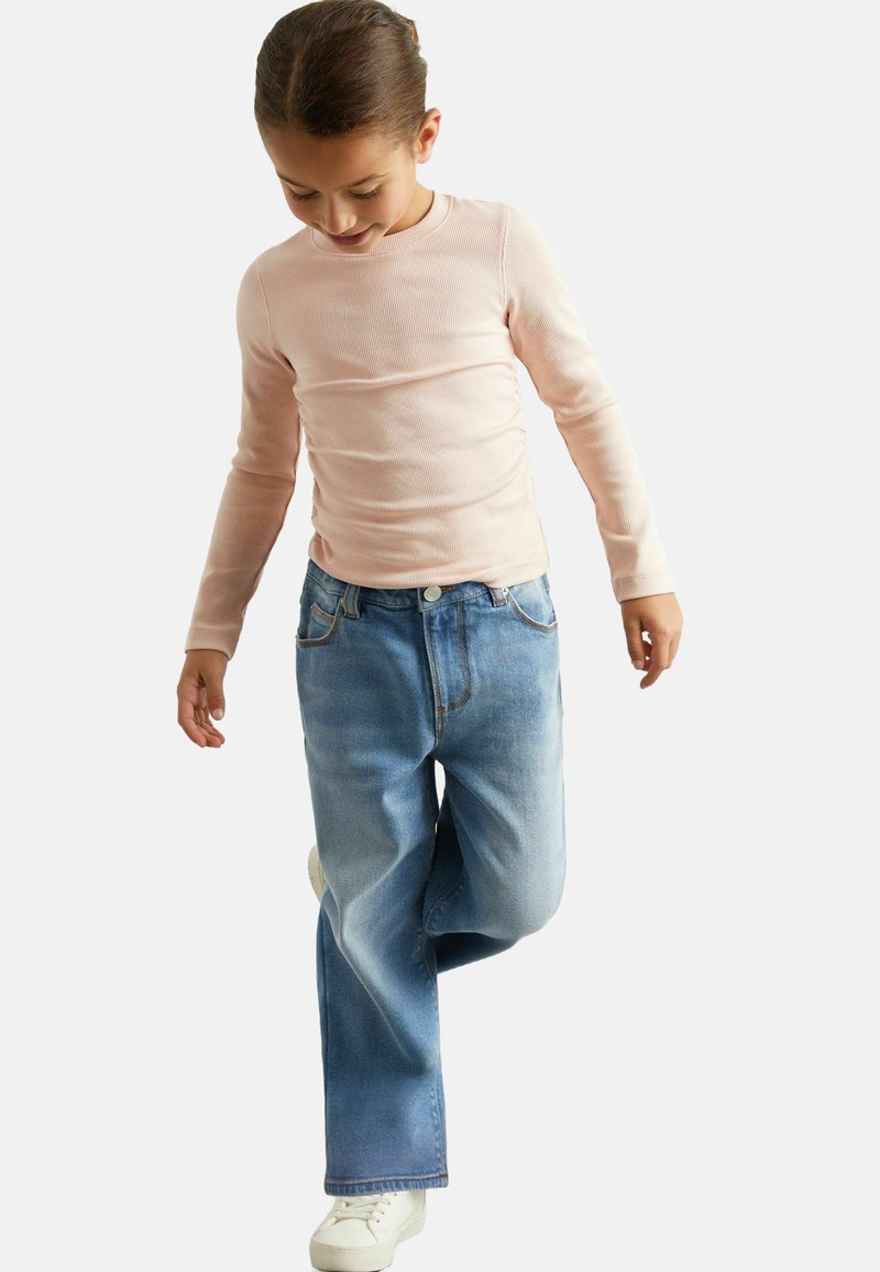Hellrosa Langarm-Rippoberteil, kombiniert mit ausgewaschenen blauen Weitbeinhosen und weißen Sneakers, mit Taschen und kontrastierenden Nähten.