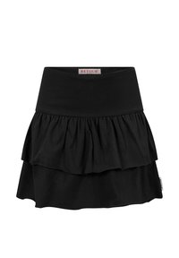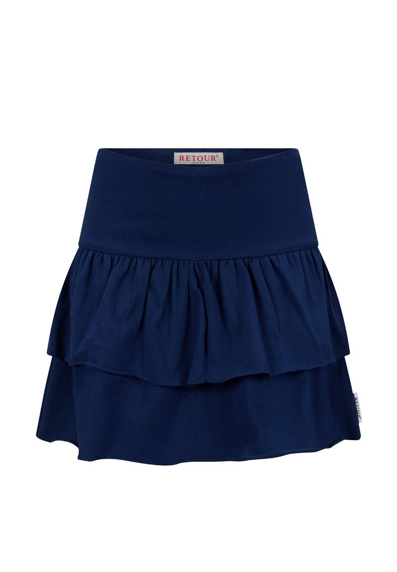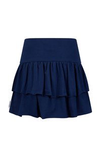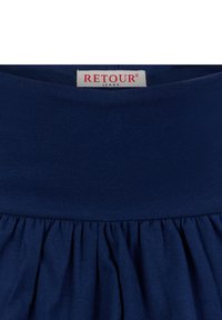 Marineblauer Stufenrock mit breitem Bund und geraffter mittlerer Lage, mit einem kleinen Markenetikett an der Seite.