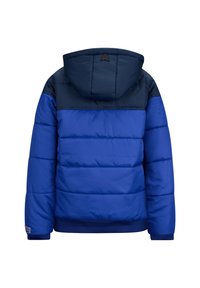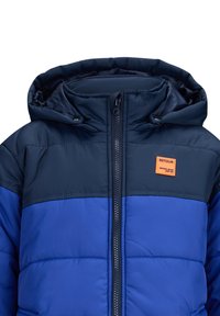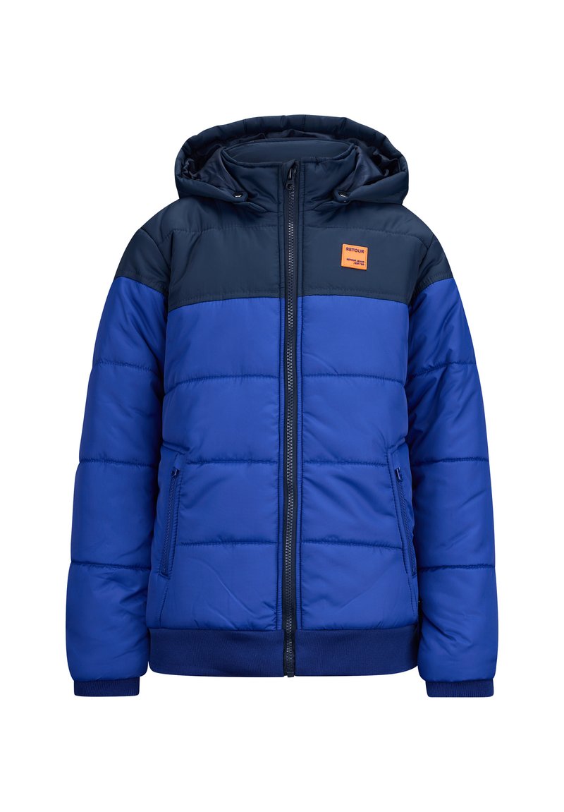 Blaues Steppjacke mit einem navyfarbenen oberen Abschnitt, Frontreißverschluss, elastischen Bündchen und Kapuze. Auf der Brust befindet sich ein kleines oranges Logo.