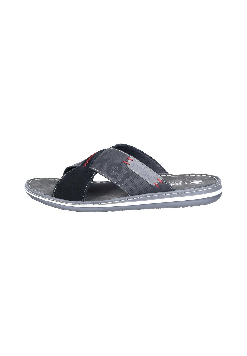 Schwarze und graue Herren-Slidesandale mit gekreuzten Riemen, roten Ziernähten und gepolsterter Sohle mit weißem und grauem Rand.
