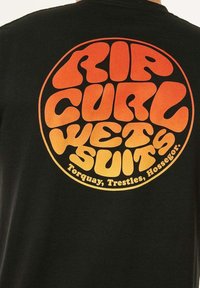Schwarzes Baumwoll-T-Shirt mit einem runden Retro-orangen und gelben Grafikdruck auf der Rückseite, der die Aufschrift "RIP CURL WETSUITS" und Standortdetails zeigt.