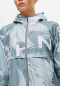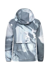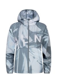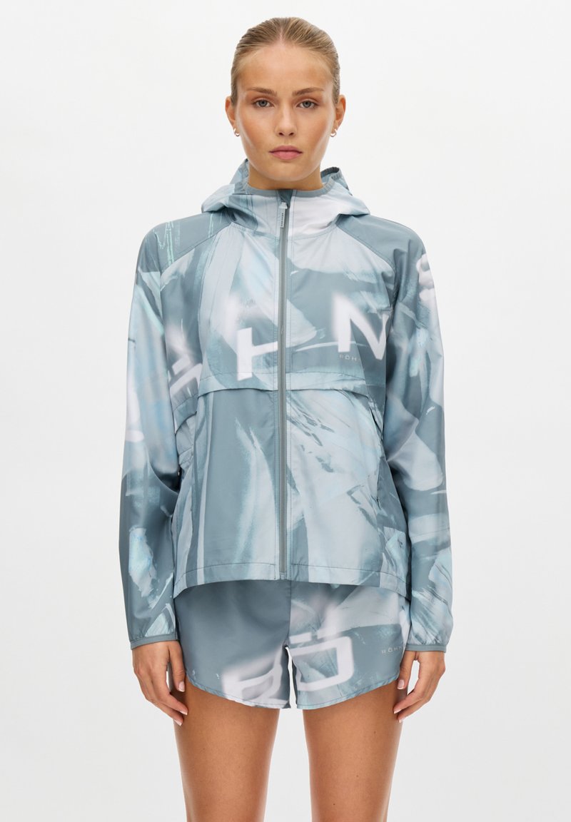 Leichte, kapuzenbesetzte Jacke in einem Verlaufsmuster aus Blau und Grau, mit Reißverschluss und Raglanärmeln, kombiniert mit passenden Shorts.