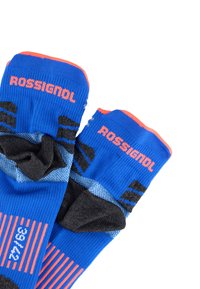 Paar blaue sportliche Knöchelsocken mit schwarzer Ferse und Zehenbereich, hellgrauen und korallenfarbenen Akzenten sowie dem Schriftzug "ROSS" am Bündchen.