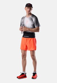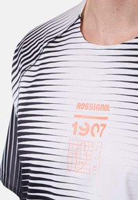 Mann trägt ein schwarzes und weißes, gestreiftes Rossignol-T-Shirt mit Verlauf, leuchtend orangefarbene Shorts und ein schwarzes Rossignol-Visier, steht links und ist vor einem einfarbigen Hintergrund abgebildet.