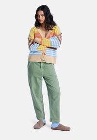 Gestrickte Strickjacke mit mehrfarbigen Streifen in Gelb, Blau, Pink und Braun, mit tiefem V-Ausschnitt und Holzknöpfen; kombiniert mit grüner Hose.