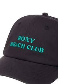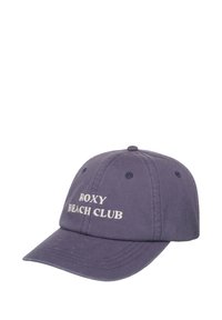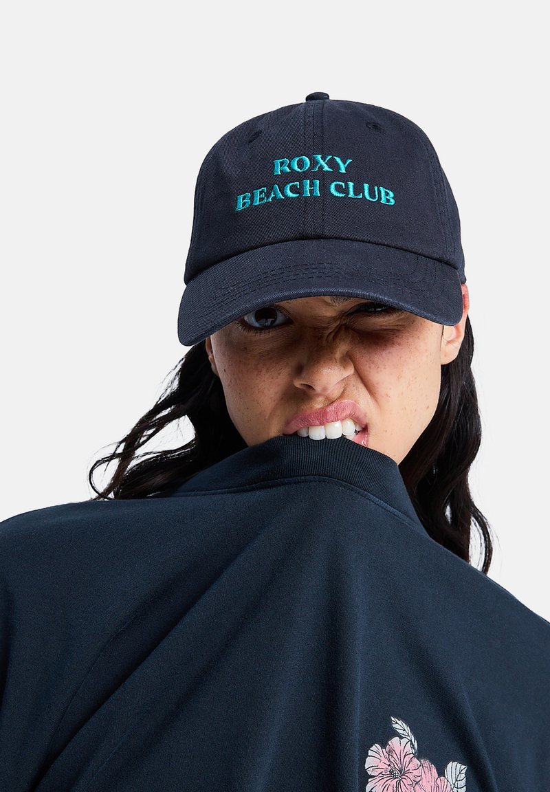 Frau mit dunkelblauer "Roxy Beach Club"-Mütze beißt auf ihr dunkelblaues Hemd mit pinkem Blumenmuster und zwinkert mit einer zusammengekniffenen Gesichtsmimik.