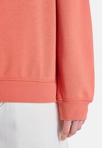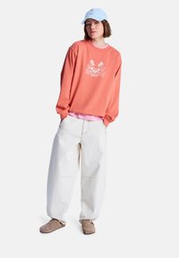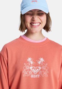 Korallenfarbener Sweatshirt mit weißem Blumenmotiv und "ROXY"-Logo, darüber ein pinkes Shirt getragen. Modell trägt eine hellblaue Kappe. Weicher Stoff, lockere Passform.