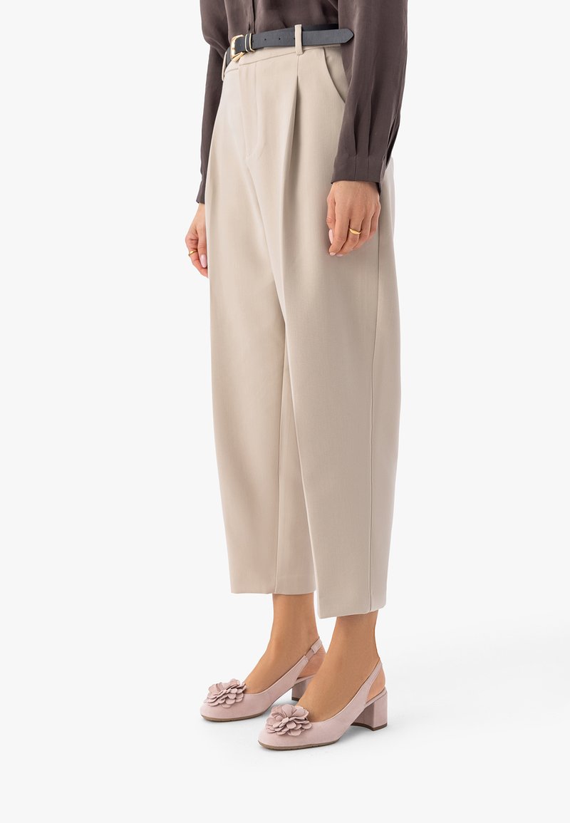 Beige, hoch-taillierte, weit geschnittene Hose kombiniert mit mauvefarbenen Slingback-Schuhen mit floralem Blockabsatz und einem dunkelbraunen Langarmtop.