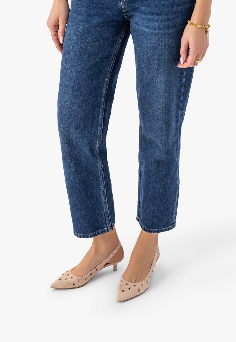 Frau trägt knöchellange blaue Jeans und beige, spitz zulaufende Schuhe mit flachem Absatz und runden Ausschnitten, steht vor weißem Hintergrund.