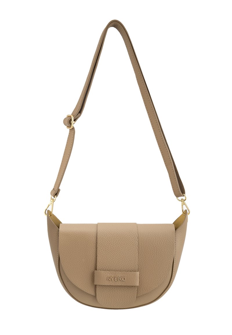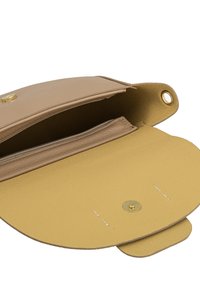 Beige Umhängetasche aus Leder mit geschwungener Form, ausgestattet mit einer Frontklappe, goldfarbenen Beschlägen und verstellbarem Riemen. Strukturierte Oberfläche und Logodetail.