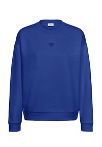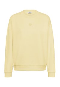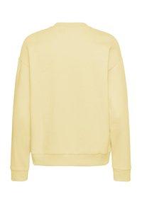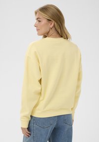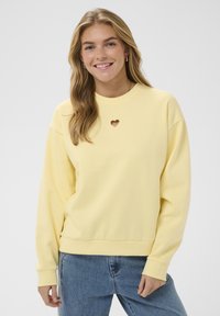 Lächelle Frau mit langen blonden Haaren, die einen hellgelben Pullover mit herzförmigem Ausschnitt und blaue Jeans trägt, steht vor einem schlichten Hintergrund.
