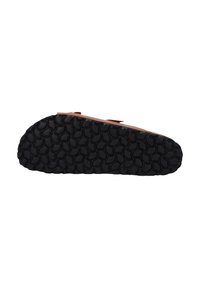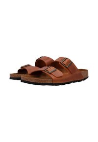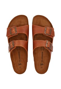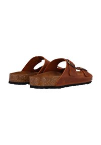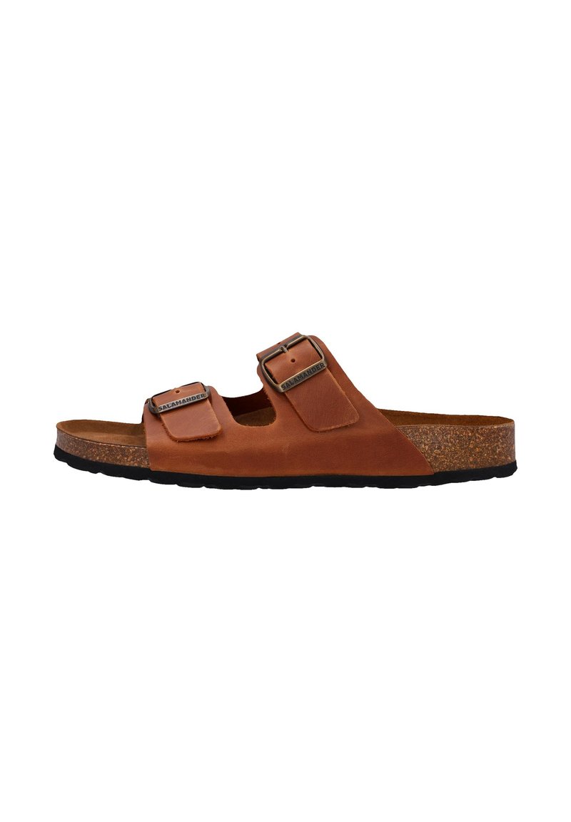 Brauner Ledersandale zum Hineinschlüpfen mit zwei verstellbaren Schnallen, Korkfußbett und schwarzer Gummisohle, Seitenansicht.
