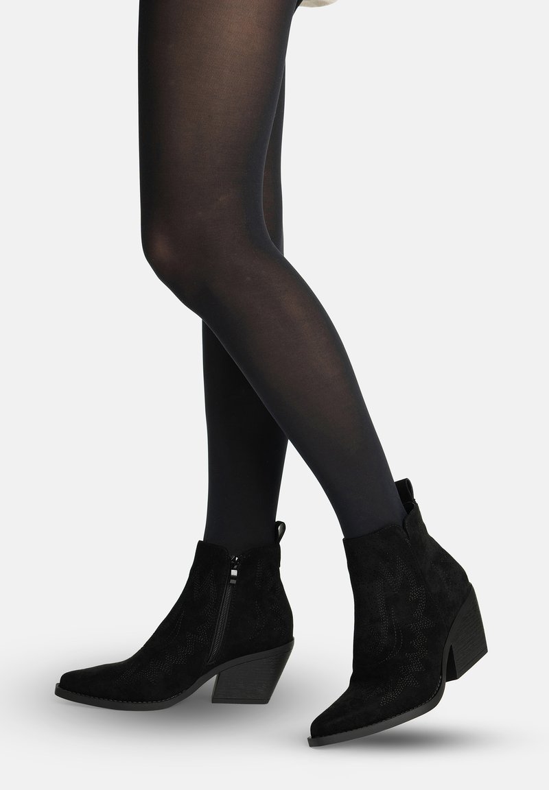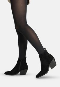 Beine, die transparente schwarze Strumpfhosen und schwarze Wildleder-Stiefeletten mit Blockabsätzen und seitlichen Reißverschlüssen tragen, stehen auf weißem Hintergrund.