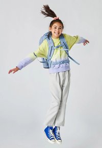 Lächelndes Mädchen, das einen pastellfarbenen Pullover, helle Hosen, blaue High-Top-Sneakers und einen hellblauen Rucksack mit Brust- und Taillengurten trägt.
