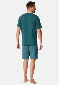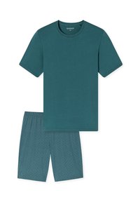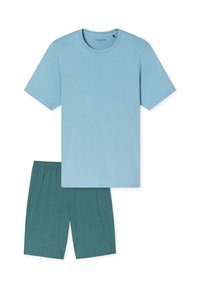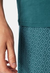 Türkisfarbenes Baumwoll-T-Shirt mit kurzen Ärmeln, kombiniert mit türkisfarbenen Shorts mit einem Diamantmuster. Beide Kleidungsstücke haben eine lockere Passform.