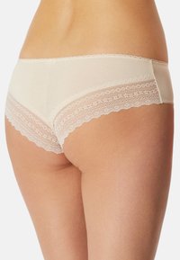 Beige Baumwoll-Hipster-Unterwäsche mit Spitzenbesatz entlang des Taillenbunds und der Seiten, mit glatter Textur und klassischem Design.