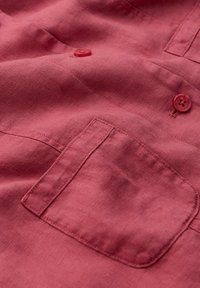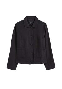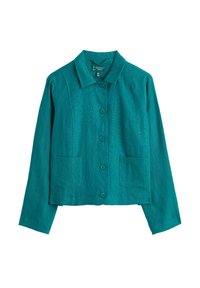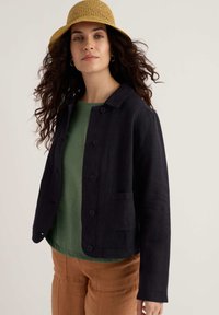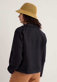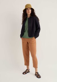 Frau mit lockigem dunklem Haar, die einen beigefarbenen, gewebten Hut, eine schwarze Jacke mit Knöpfen, ein grünes Hemd und braune Hosen vor einem einfachen hellen Hintergrund trägt.