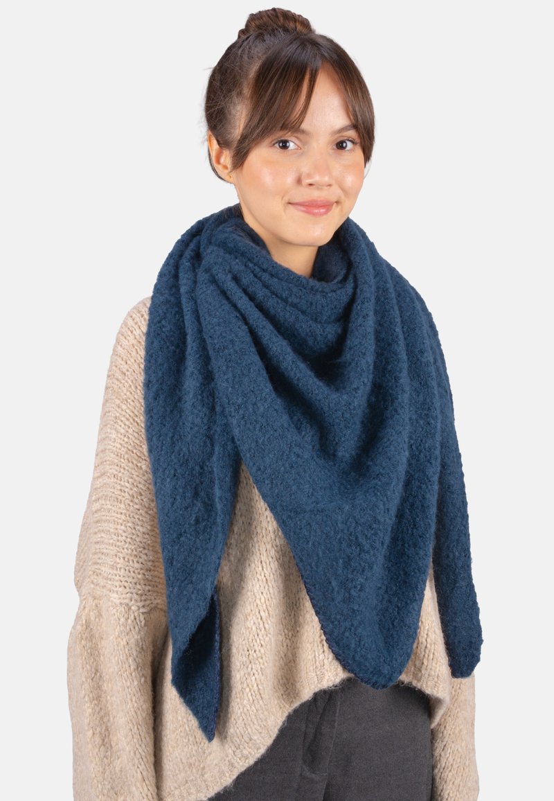 Eine marineblaue, strukturierte Wollschal liegt über einem hellbeigen Pullover und bildet eine dreieckige Form mit spitzen Enden.