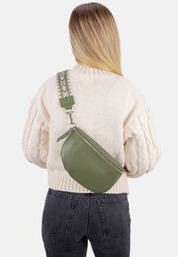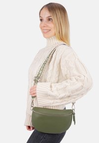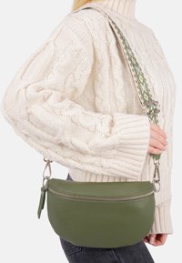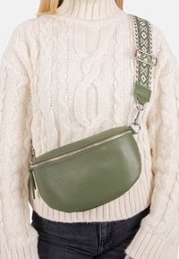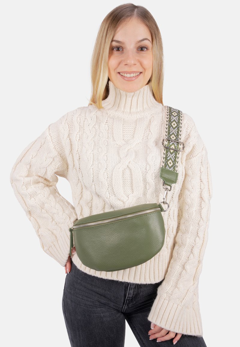 Grünes Lederbauchtasche mit runder Form und silbernem Reißverschluss, ausgestattet mit einem gemusterten Gurt in Grün und Creme. Getragen über einem cremfarbenen, strukturierten Sweater.