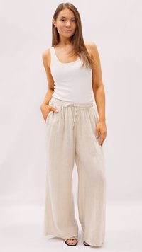 Beige Leinenhose mit weitem Bein, elastischem Bund und Kordelzug, kombiniert mit schwarzen Sandalen mit quadratischer Spitze und weißem Oberteil.