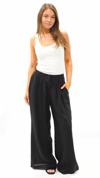 Frau trägt lockere schwarze, weit geschnittene Hosen mit Kordelzug, kombiniert mit schwarzen Sandalen mit quadratischer Spitze und einem weißen ärmellosen Oberteil.