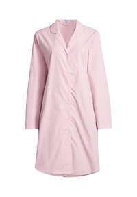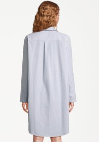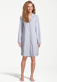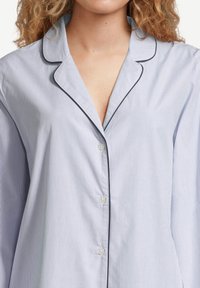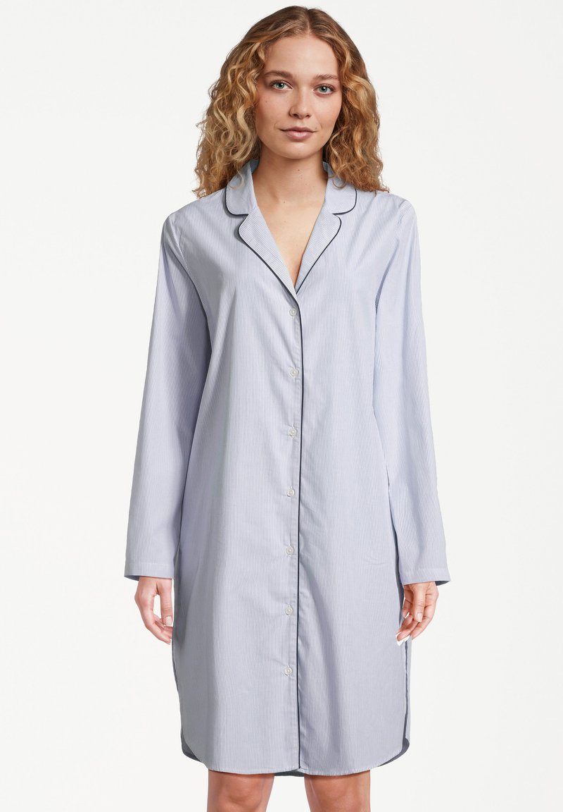 Frau mit lockigem Haar, die ein langärmeliges, knielanges, hellblaues Nachthemd mit Knöpfen trägt, das dunkle Paspeln am Kragen und an den Manschetten hat.