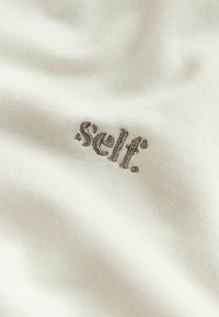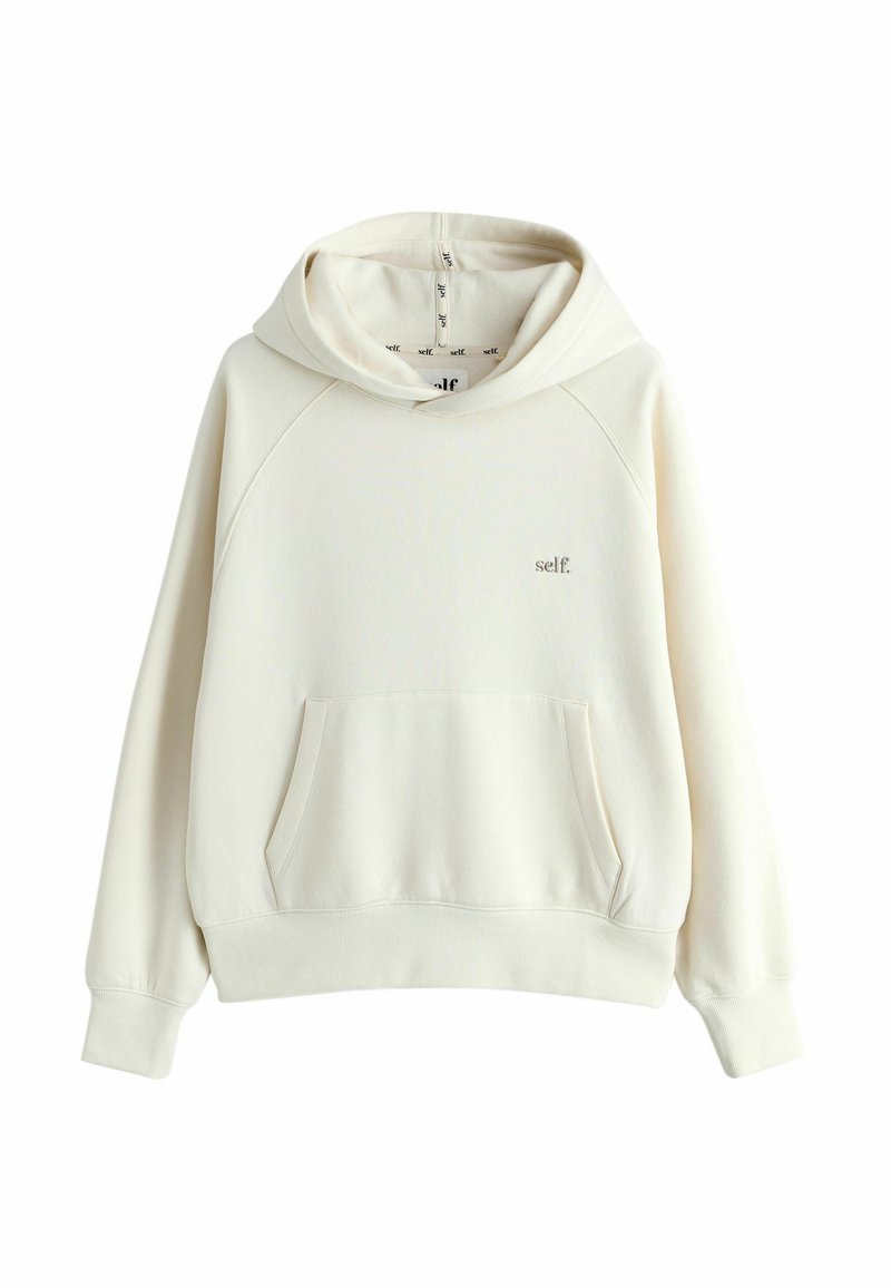Cremefarbener Hoodie mit Fronttasche und kleinem "self."-Logo auf der linken Brust, präsentiert auf weißem Hintergrund.
