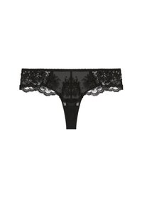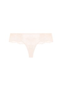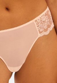 Hellrosa Spitzen- und durchsichtiger Netz-Bikini-Unterwäsche, getragen am unteren Rumpf eines weiblichen Modells, mit einer Hand an der Hüfte.