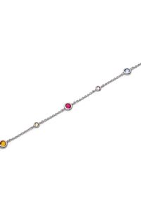 Silbernes Kettenarmband mit drei kleinen farbigen Steinen: blau, rosa und lila, in einem filigranen Design gefasst. Hand ruht in der Jeansjackentasche.