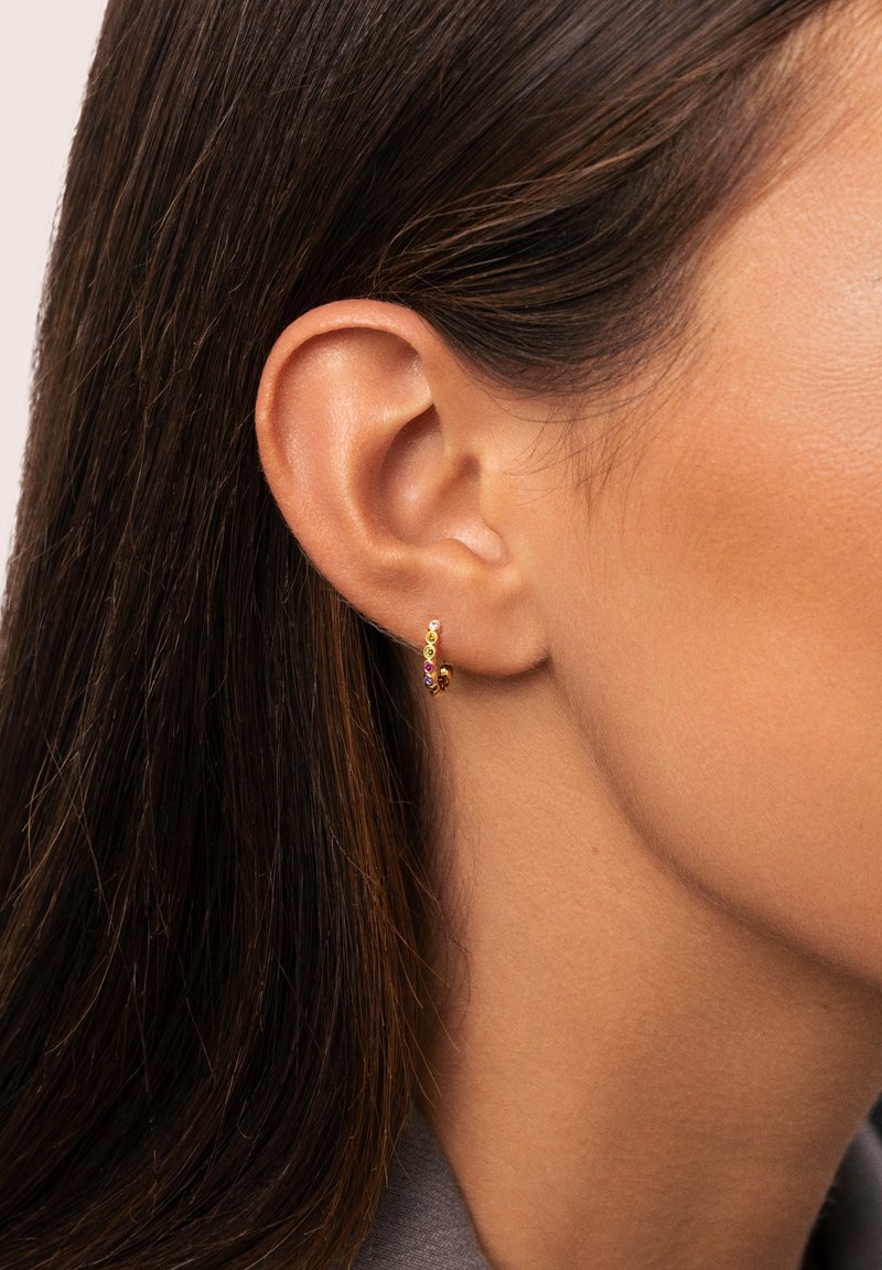 Der lose Ohrring Orbit Hoop mit 18 Karat Goldbeschichtung ist ein farbenfrohes Piercing mit Kristallkreis, das sich perfekt dazu eignet, Ihrem Ohr-Look einen Hauch von Farbe zu verleihen.