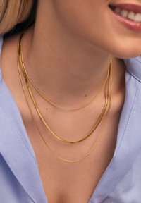 Die vergoldete Stahlkette Maat besticht durch ihr mehrlagiges Design mit drei unterschiedlich langen Ketten, die einen Kaskadeneffekt erzeugen, den Sie lieben werden. Die dünnen, glatten Ketten mit glänzendem Finish sind die perfekte Ergänzung zu einem tief ausgeschnittenen Kleid.