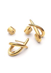 Goldfarbene Ohrringe mit einem abstrakten, ineinandergreifenden Design, sicher befestigt, vor neutralem Hintergrund präsentiert.