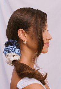 Set aus drei Satin-Haargummis in Creme, Hellblau und Marineblau. Jeweils mit weicher, glatter Textur und gerafftem Elastikdesign.