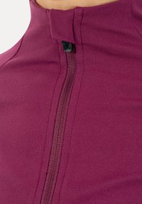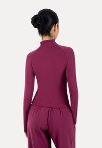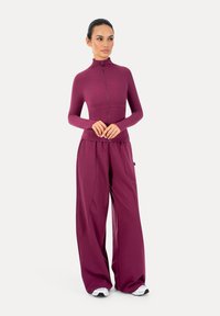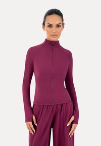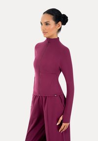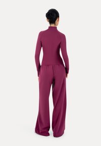 Frau mit dunklem Haar, die ein enganliegendes, langärmeliges Zip-up-Oberteil und lockere Hose trägt, beide aus passendem tiefviolettem Stoff, vor schlichtem Hintergrund stehend.